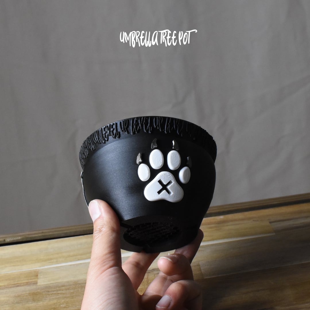 鉢のふちにぐるりと刻まれた「LEVEL UP」の文字は、この子が進化した証です。はじまりは、ただのまるくてやわらかな肉球でした。